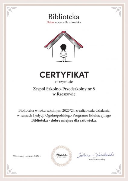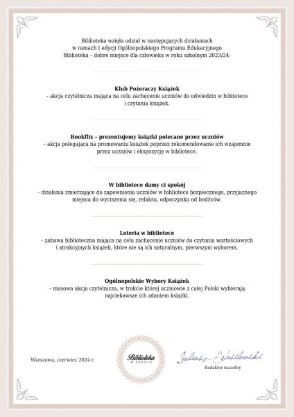 Z dumą i satysfakcją ogłaszamy, że w roku szkolnym 2023/2024 w naszej szkole zrealizowano Program dla Bibliotek Szkolnych „Biblioteka – dobre miejsce dla człowieka”, którego celem była promocja czytania, aktywizacja bibliotek szkolnych oraz wsparcie pozytywnego wizerunku biblioteki szkolnej jako przyjaznego i bezpiecznego miejsca w szkole. Wszystkie akcje czytelnicze przeprowadzone w ramach programu relacjonowaliśmy na bieżąco na naszej stronie i Facebooku. Cieszyły się one dużym zainteresowaniem uczniów, dzięki czemu znacząco podniosła się statystyka wypożyczeń oraz odwiedzin w czytelni. Niektóre działania tak spodobały się uczniom, że planujemy kontynuować je w roku szkolnym 2024/2025.