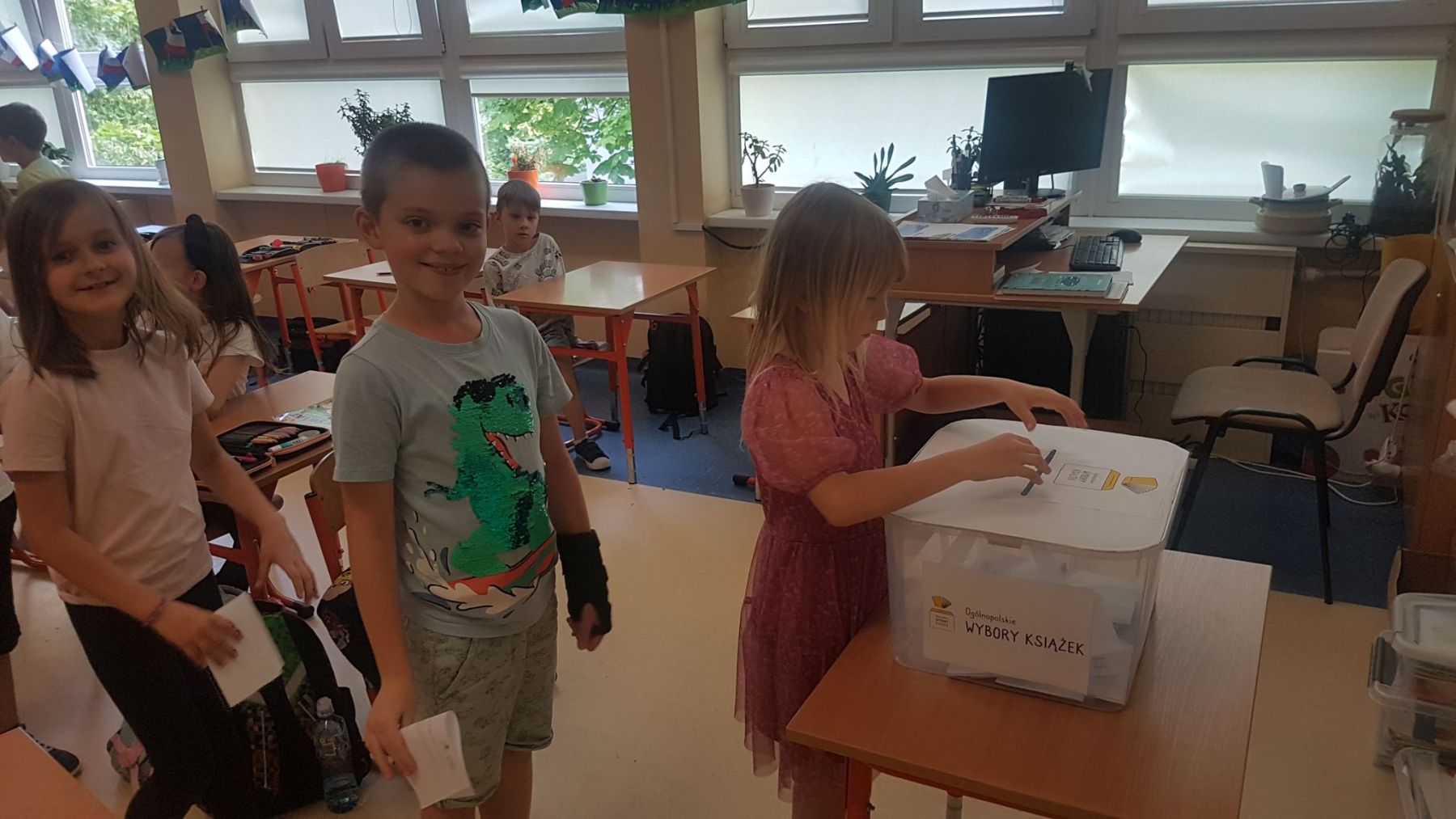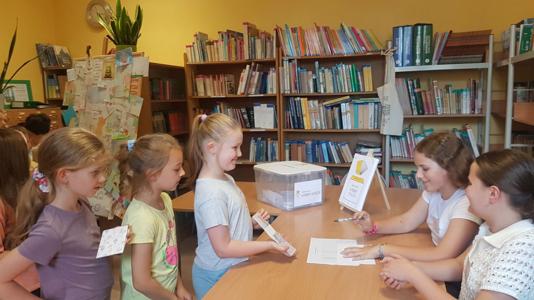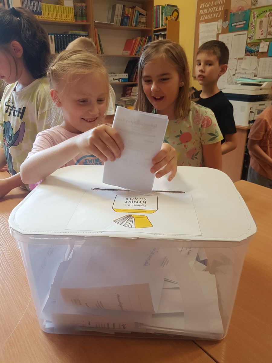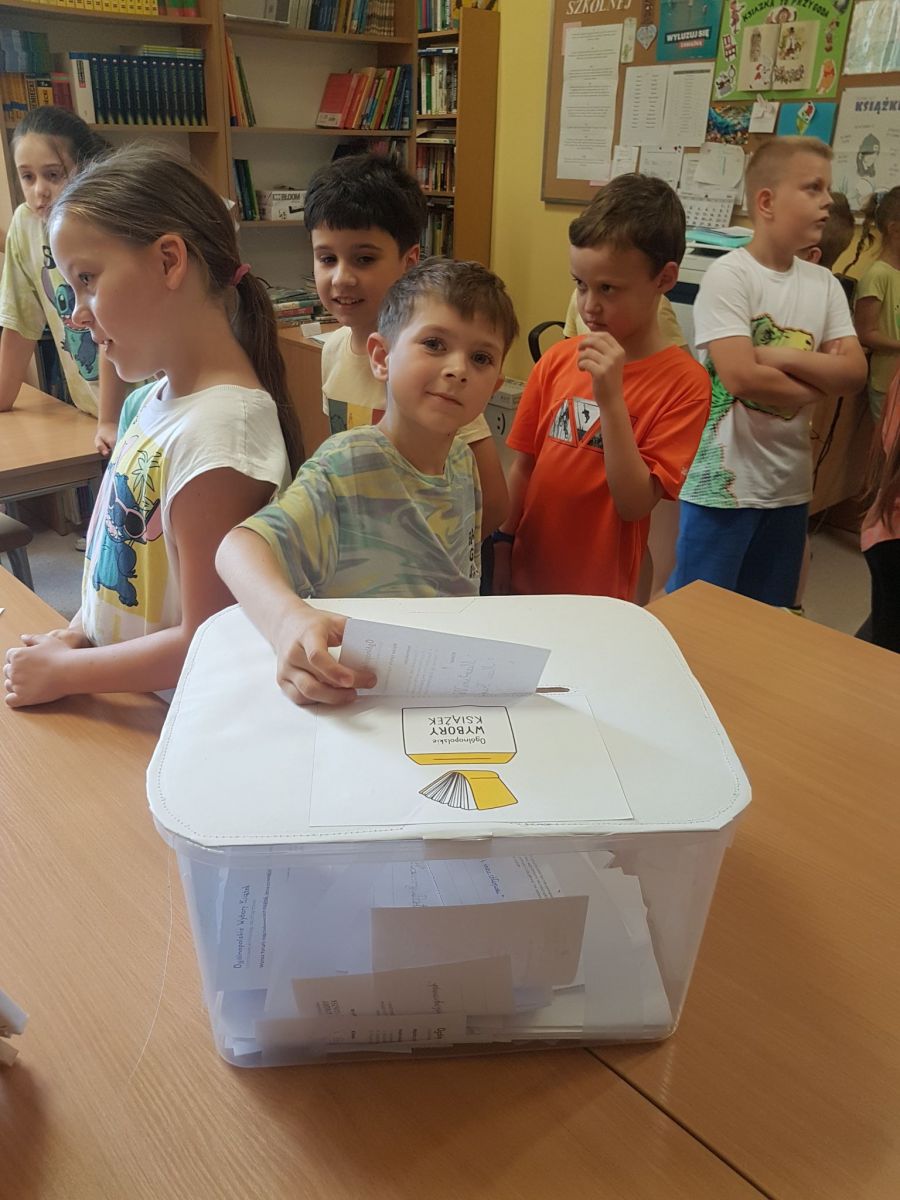 W naszej szkole wybory odbyły się w dniach 6-7 czerwca. Powołano specjalną Komisję Wyborczą składającą się z siedmiu uczennic z kl. 5a. Wybory miały charakter mieszany – ruchomy i stacjonarny. Lokal wyborczy zorganizowano w bibliotece, gdzie komisja sprawdzała legitymację uczniów i po uzyskaniu podpisu na protokole czuwała nad wyborcami oddającymi swoje głosy do specjalnej urny – ta część wyborów była doskonałą, praktyczną formą edukacji obywatelskiej. Ruchoma Komisja Wyborcza udała się także do niektórych klas na lekcje. 10 czerwca komisja zebrała się, by przeliczyć głosy i stworzyć listę ulubionych książek naszych uczniów. W klasach 1-3 oddano głosy na 89 książek, w klasach 4-6 – na 58 książek, zaś w kl. 7 – na 12 książek. W wyborach wzięło udział 250 uczniów, którzy łącznie oddali 480 głosów! Głosy naszych uczniów zostały wysłane do organizatorów, czekamy na ogólnopolskie wyniki.