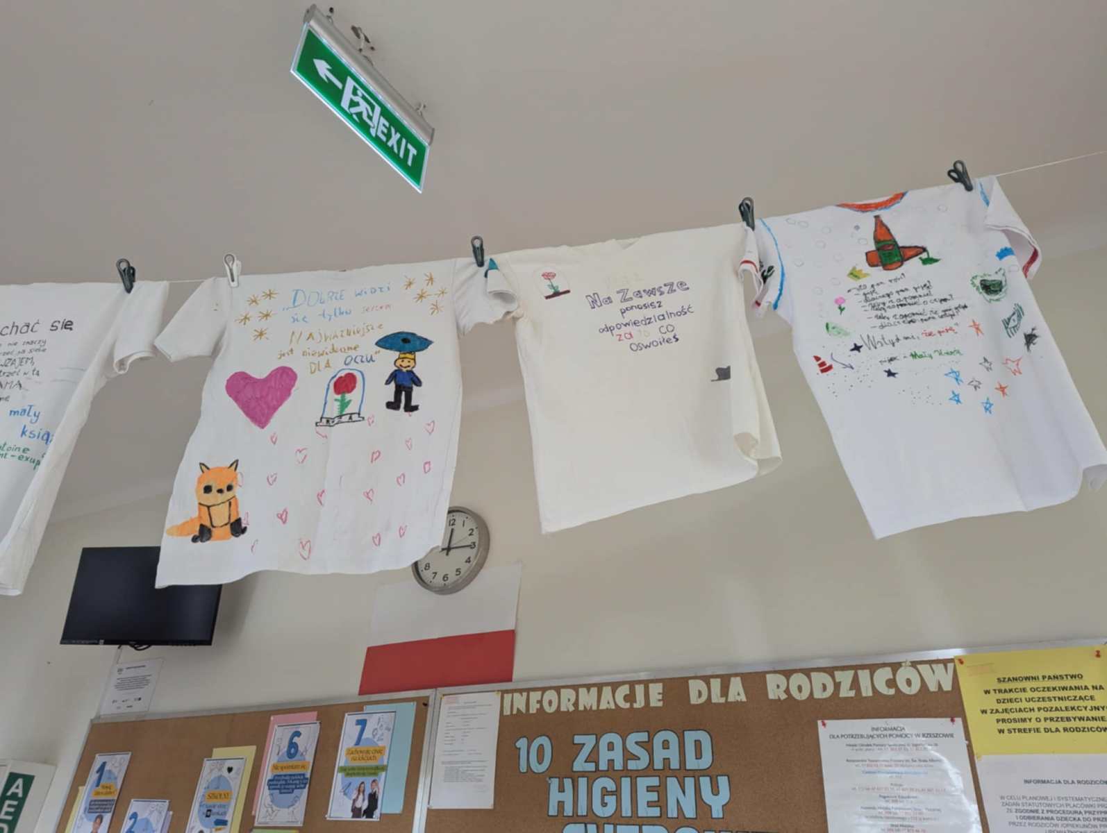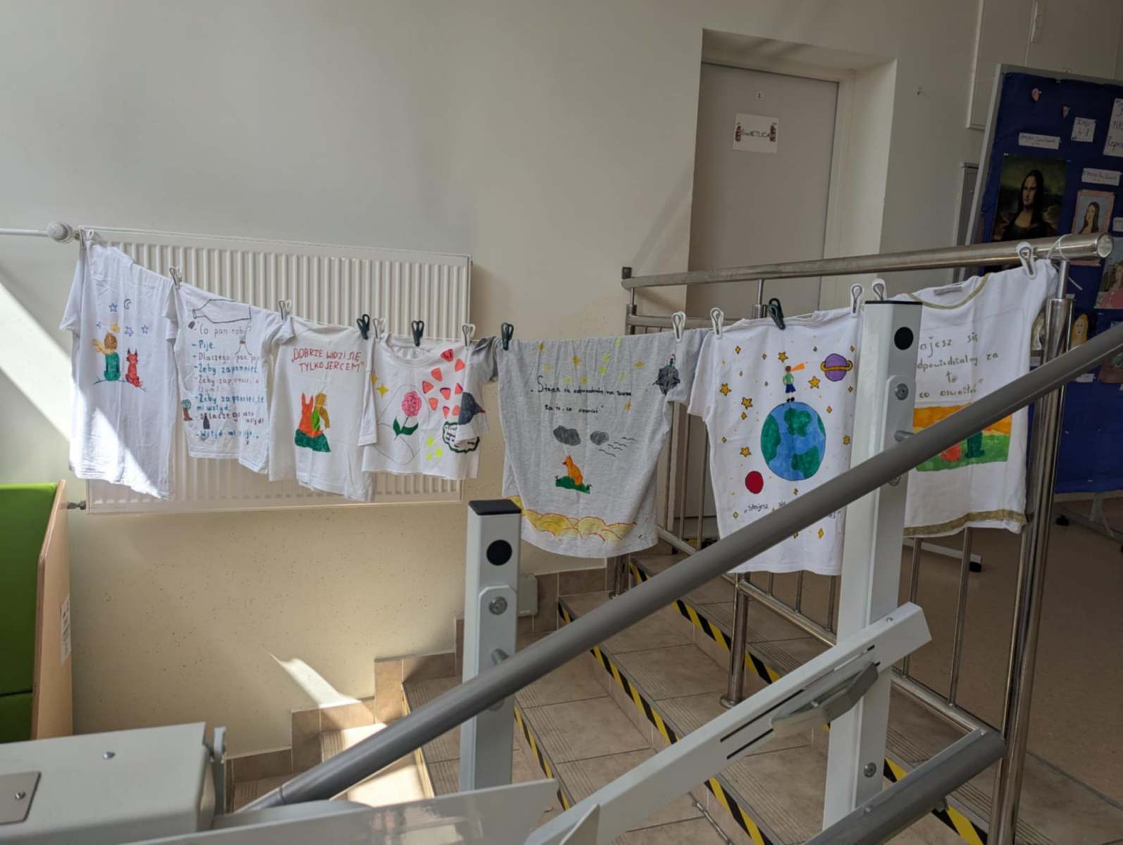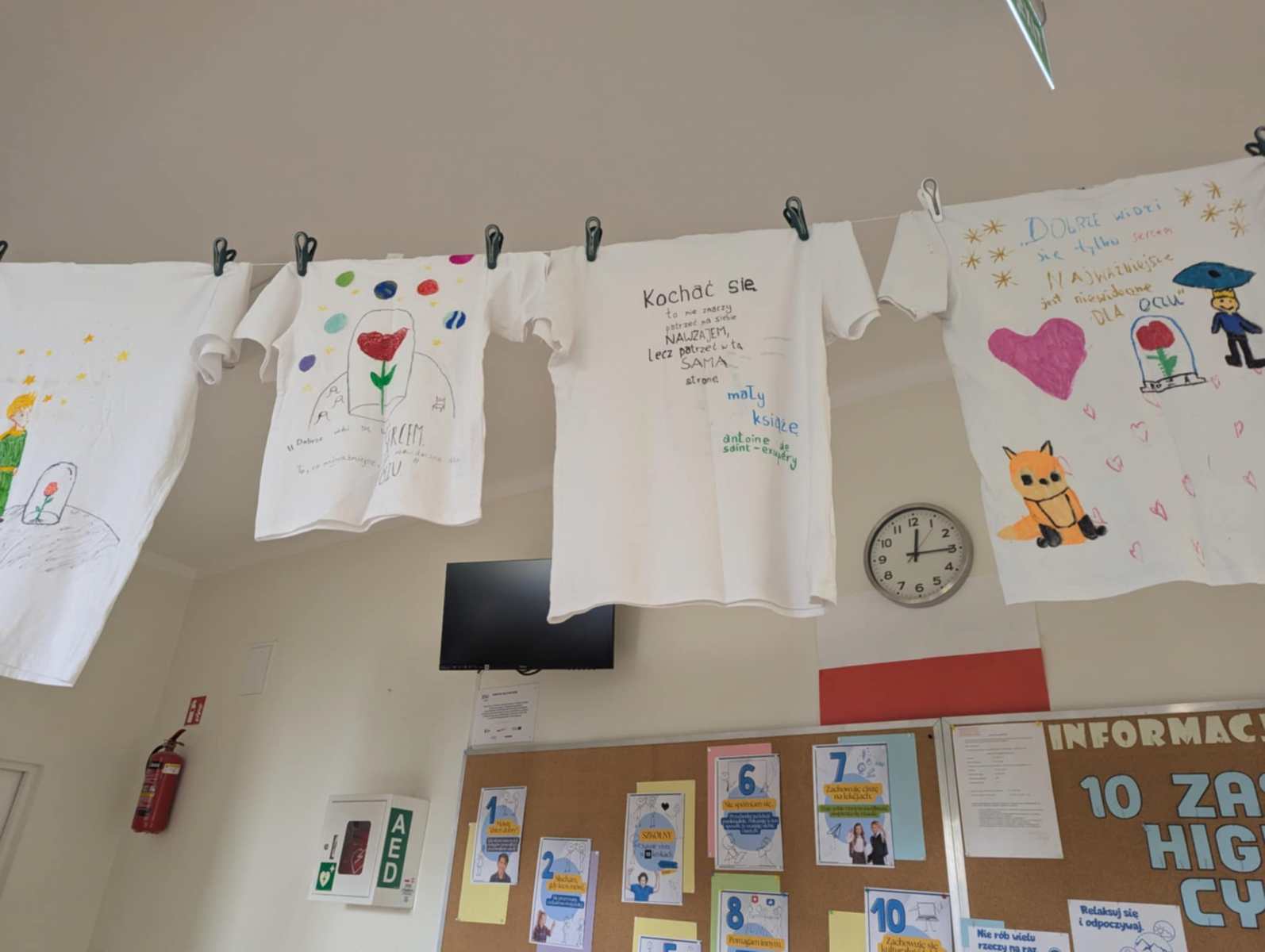 W ramach projektu edukacyjnego uczniowie klas 7 przygotowali koszulki z wybranym cytatem i grafiką inspirowaną książką „Mały Książę” Antoine’a de Saint-Exupéry’ego. Gotowe prace zostały wywieszone w holu szkoły, tworząc kolorową ekspozycję, która ma na celu promowanie czytelnictwa wśród uczniów.