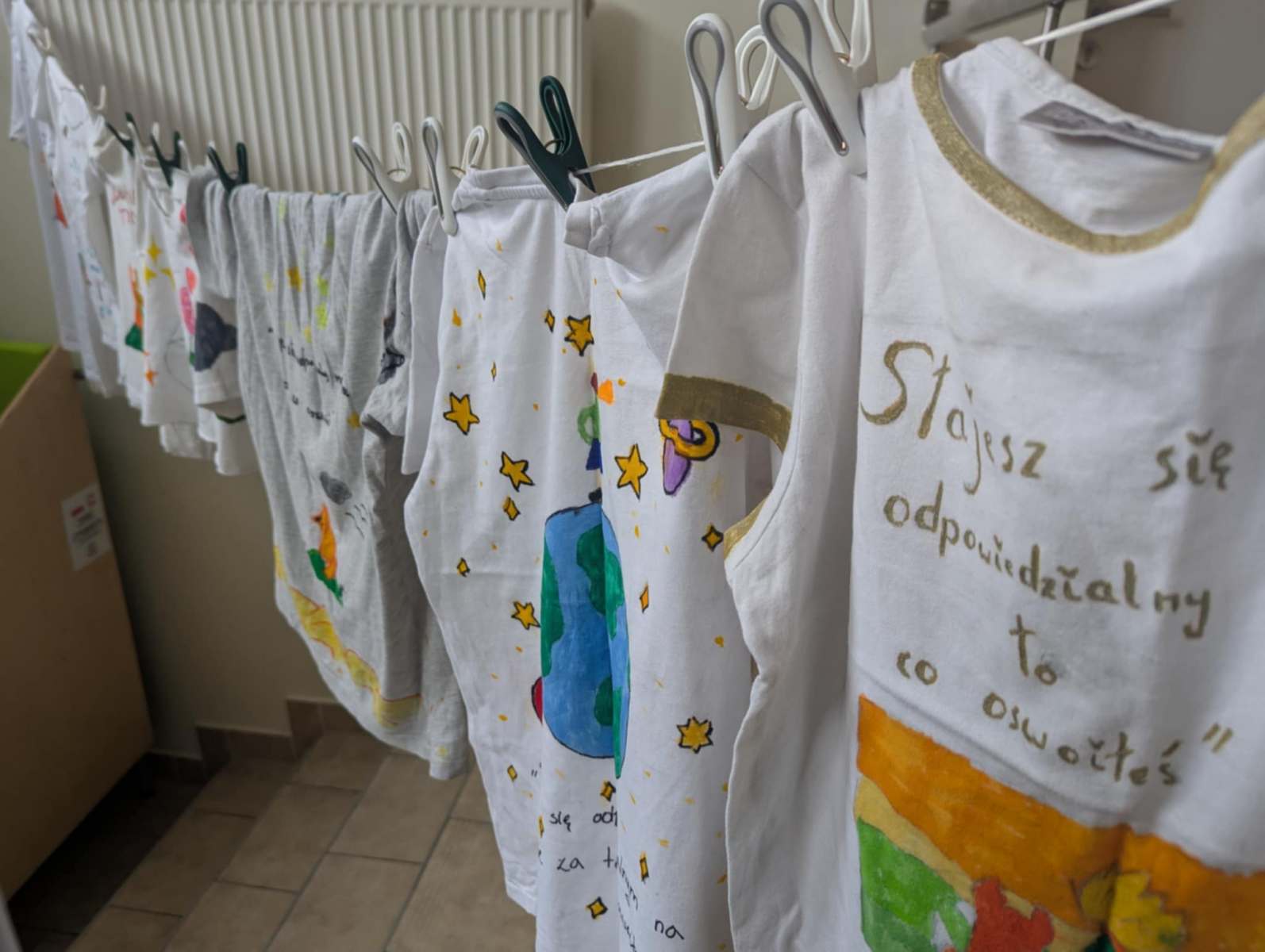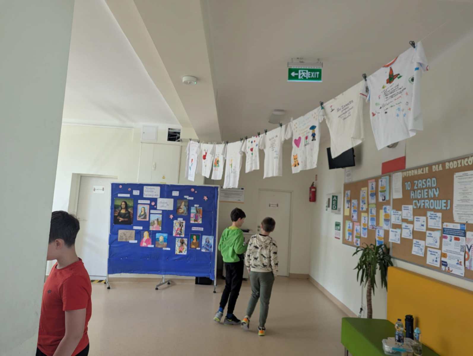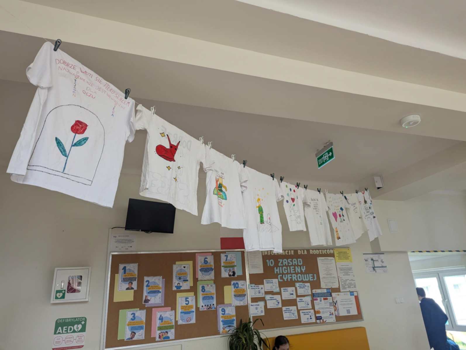 W ramach projektu edukacyjnego uczniowie klas 7 przygotowali koszulki z wybranym cytatem i grafiką inspirowaną książką „Mały Książę” Antoine’a de Saint-Exupéry’ego. Gotowe prace zostały wywieszone w holu szkoły, tworząc kolorową ekspozycję, która ma na celu promowanie czytelnictwa wśród uczniów.