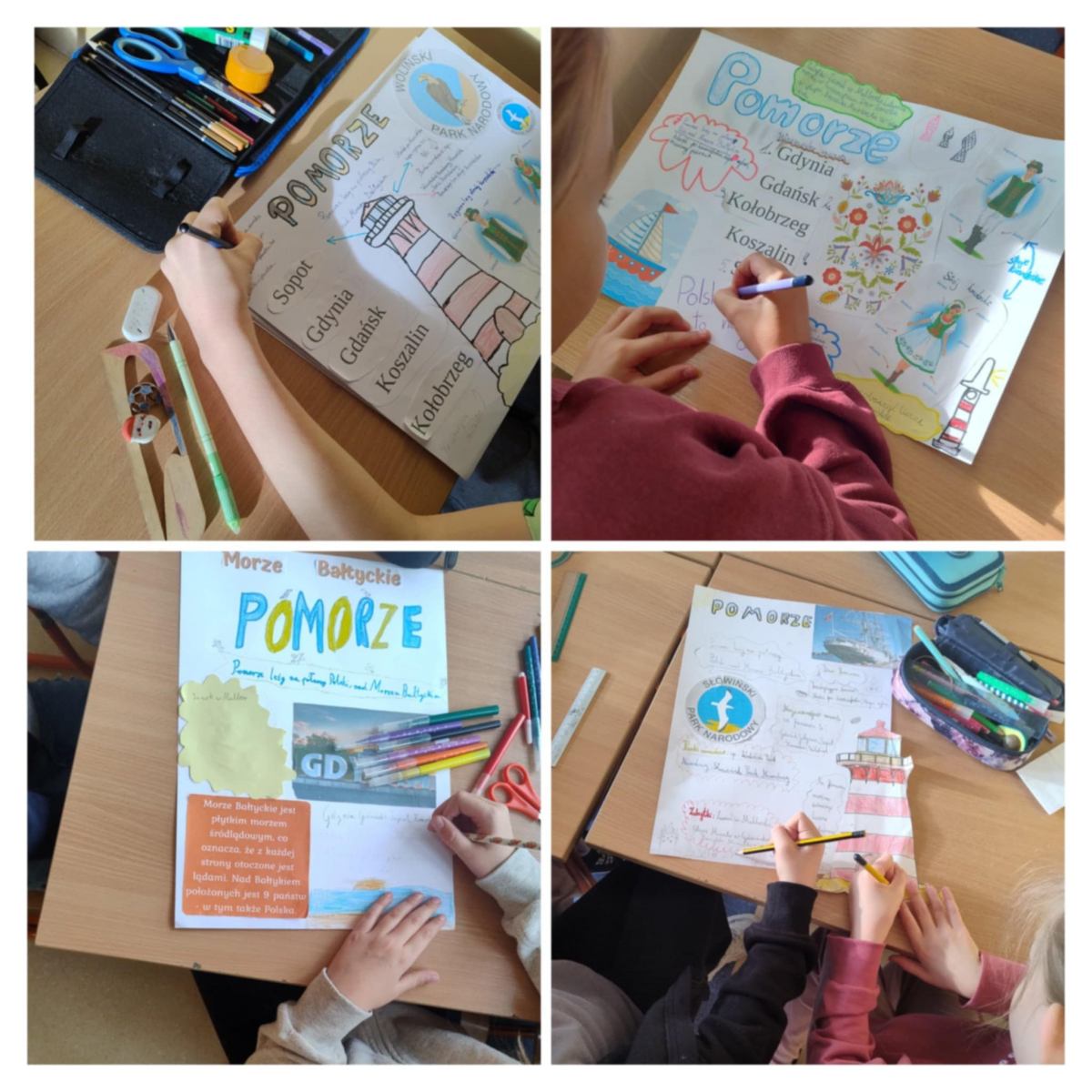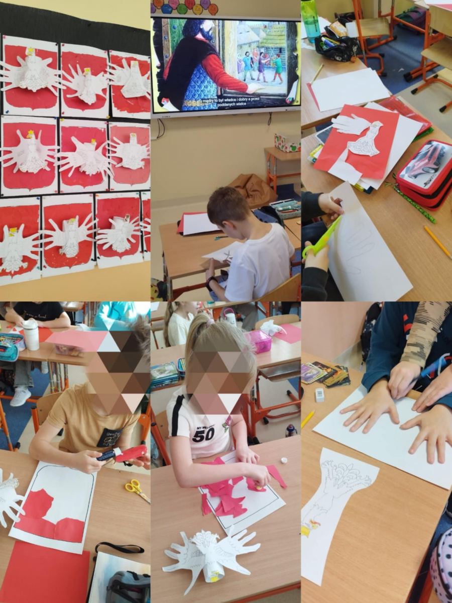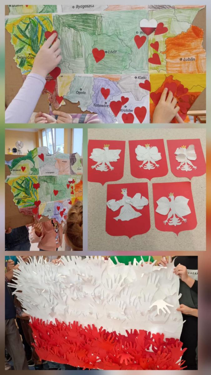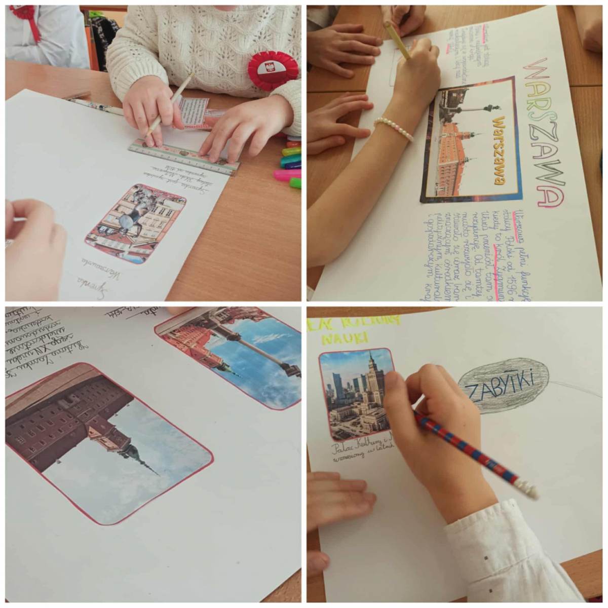 z odrysowanych dłoni, godła wykonane z różnych materiałów oraz mapa Polski, na której dzieci zaznaczyły miejsca pochodzenia swoich rodzin. Efektem wspólnej pracy była pełna dziecięcej kreatywności wystawa zatytułowana „Polska oczami pierwszaków”. Drugoklasiści poznawali polskie legendy i zainspirowani nimi przygotowali komiksy, makiety i plakaty. Dzięki wspólnej pracy i zabawie przenieśli się do świata dawnych opowieści o Warsie i Sawie, Popielu, a także o Lechu, Czechu i Rusie. W ten sposób utrwalili wiedzę o historii naszego kraju i jego początkach. Trzecioklasiści natomiast odbyli wędrówkę po polskich regionach, odkrywając ich bogactwo kulturowe i przyrodnicze. Przygotowali plakaty, prezentacje, przewodniki po Warszawie oraz prace plastyczne przedstawiające m.in. Kraków, Warszawę i nadmorskie krajobrazy.