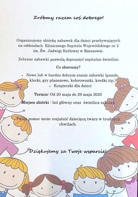 Szkolne Koło Wolontariatu zaprasza całą szkolną społeczność do włączenia się w zbiórkę zabawek dla dzieci przebywających na oddziałach Klinicznego Szpitala Wojewódzkiego nr 2 w Rzeszowie.
