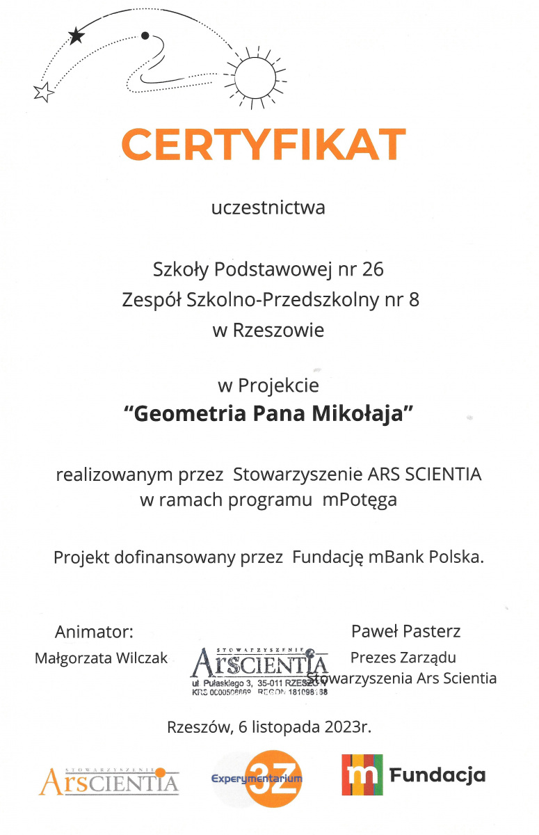 14 listopada uczniowie klasy 7a odwiedzili Experymentarium 3Z, gdzie uczestniczyli w warsztatach realizowanych przez stowarzyszenie ArsScientia w ramach projektu współfinansowanego przez Fundację mBank Polska pod nazwą mPotęga – Geometria Pana Mikołaja. Podczas zajęć trwających dwie godziny, uczniowie poznali wiele ciekawych informacji z życia Mikołaja Kopernika oraz wiadomości ze świata fizyki. Wykonali również własnoręcznie Kwadrat Słoneczny do pomiaru wysokości kątowej Słońca w południe oraz podczas najdłuższego i najkrótszego dnia w roku. Dziękujemy Prowadzącym za wspólnie spędzony czas i atrakcyjne zajęcia. Zapraszamy do obejrzenia zdjęć.