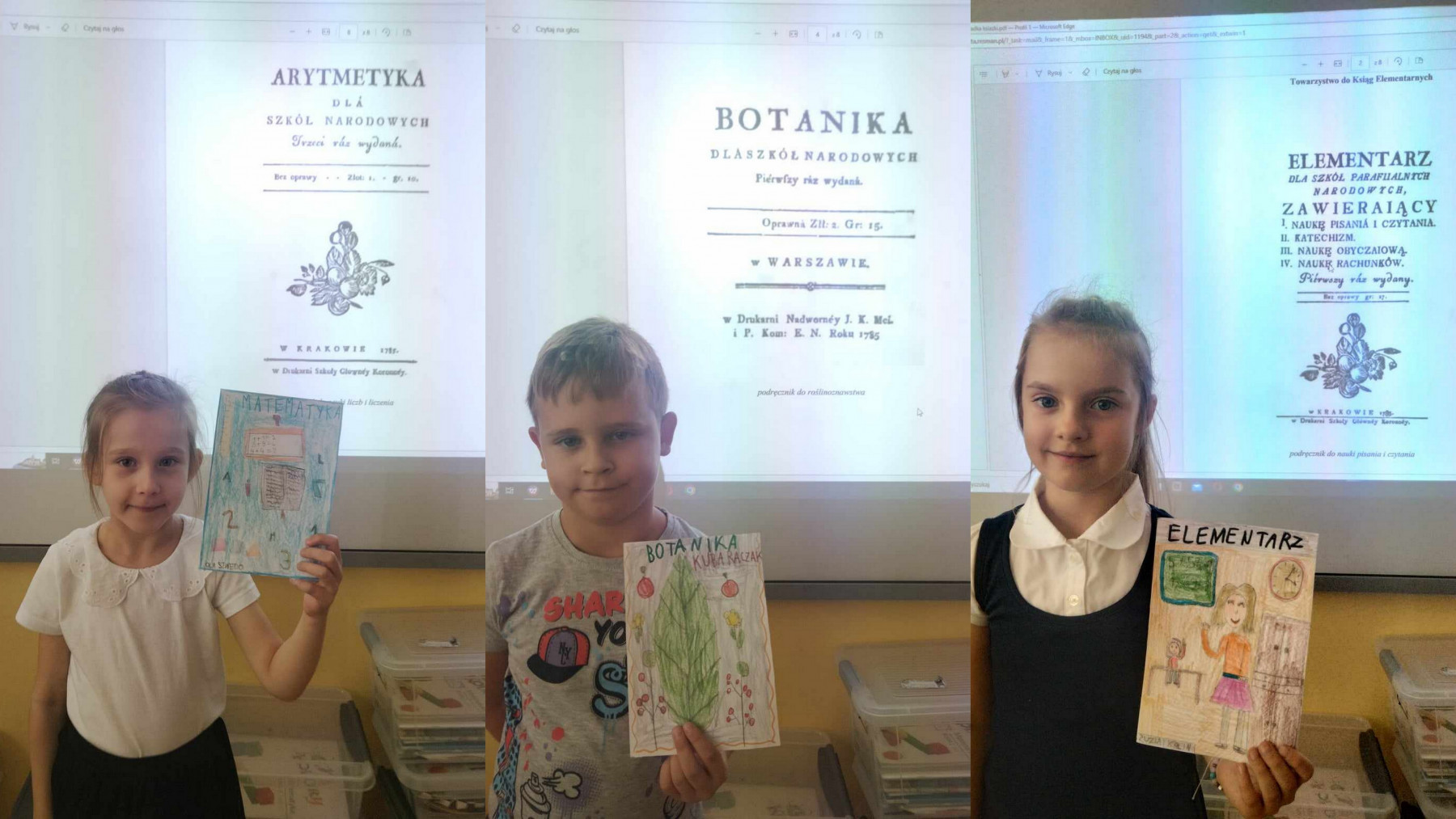 Z okazji urodzin Komisji Edukacji Narodowej przygotowano dla naszych uczniów kilka atrakcji. Klasy pierwsze zapoznały się z tym jak utworzyć okładkę książki. Później przygotowały swoje, które można podziwiać na gazetce szkolnej. Klasy drugie i trzecie poznały historię kaligrafii. Podczas zajęć ćwiczyły tamtejsze pismo oraz oglądały książki z pismem z tamtych czasów. Spróbowali również swoich sił i zapisywali różne teksty czcionką, która była używana w XX wieku w polskich szkołach.