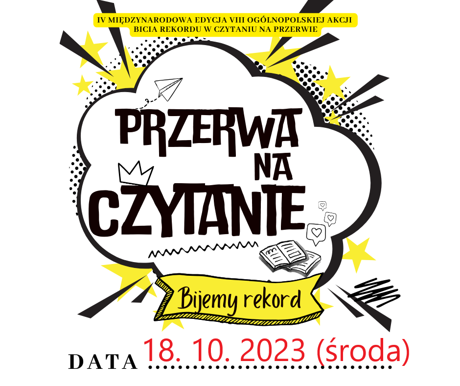 Już w najbliższą środę (18. 10.2023) nasza szkoła weźmie udział w czwartej międzynarodowej edycji bicia rekordu w liczbie osób czytających na przerwie, organizowanej przez Bibliotekę Pedagogiczną Wojewódzkiego Ośrodka Metodycznego w Gorzowie Wielkopolskim.
