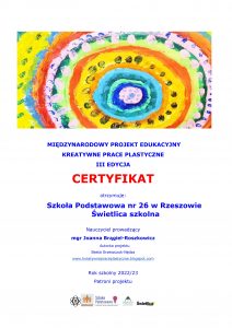 Drodzy Państwo miło nam poinformować, że świetlica szkolna ukończyła z sukcesem udział w międzynarodowym projekcie edukacyjnym pt. „Kreatywne prace plastyczne” realizowanym w naszej placówce od września od maja bieżącego roku szkolnego.