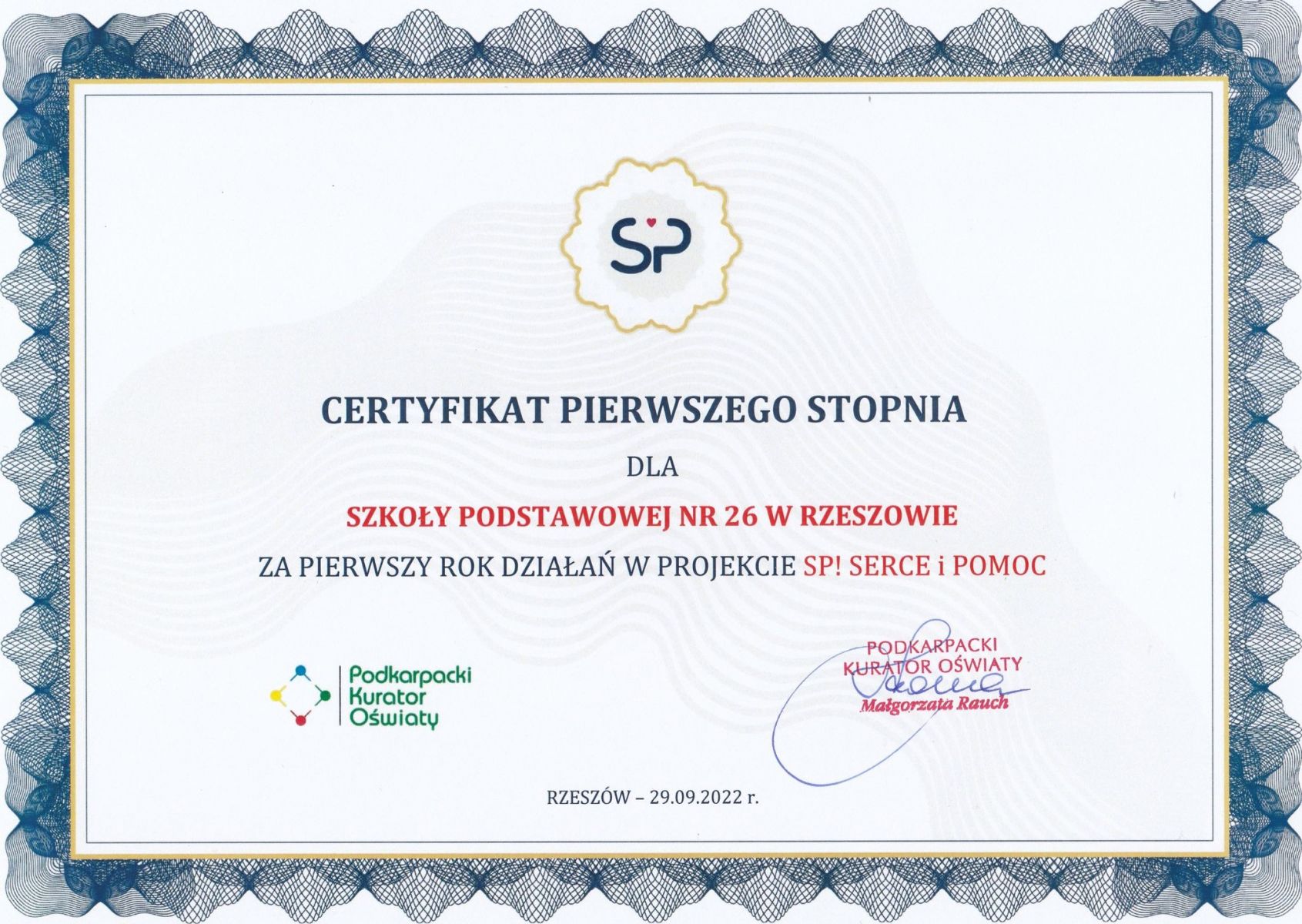 Dzień 29.09.2022 r. zapisze się w naszej szkole jako szczególny. Z dumą informujemy, iż tego dnia – podczas uroczystej konferencji – Panin Dyrektor Dorota Kozioł odebrała z rąk Pani Kurator – Małgorzaty Rauch – Certyfikat Pierwszego Stopnia za udział w projekcie SP! Serce i Pomoc. To nie koniec – nie zatrzymujemy się! Działamy dalej, ponieważ jesteśmy głęboko przekonani, że to, co robimy jest słuszne!