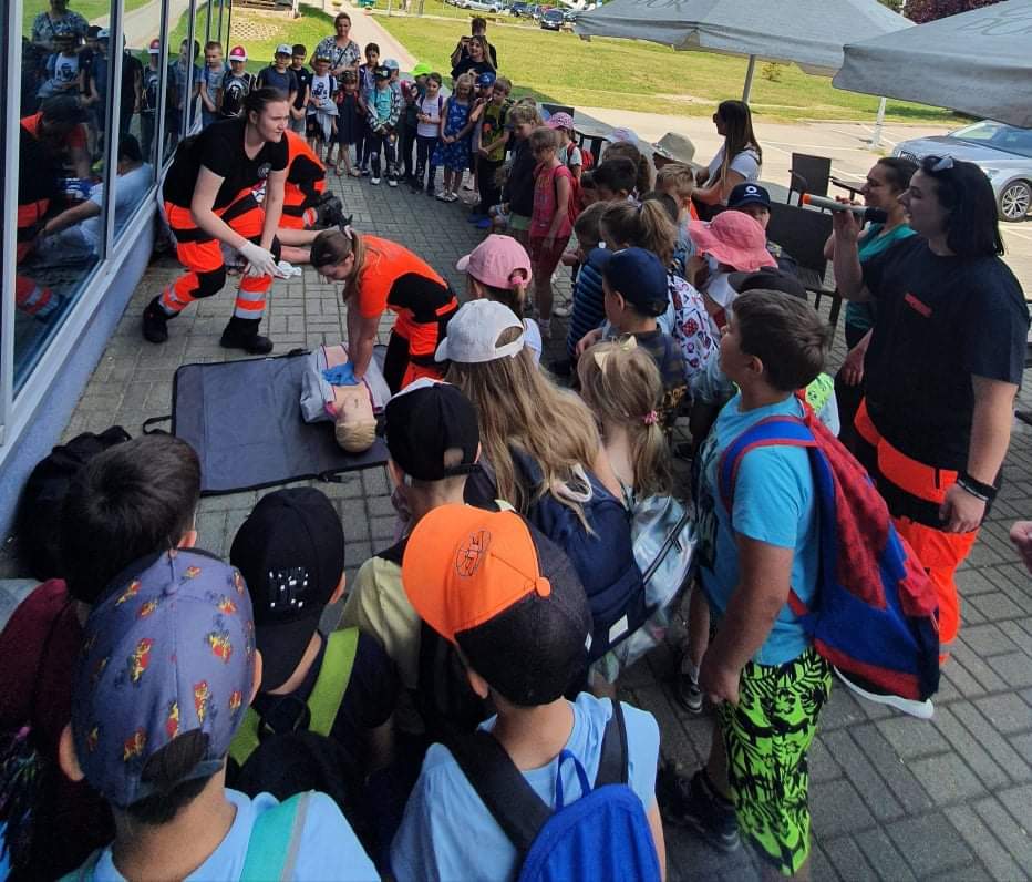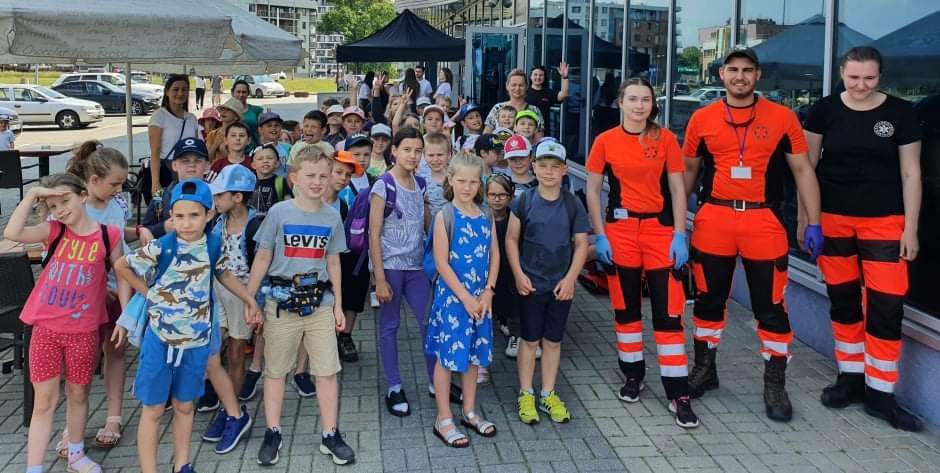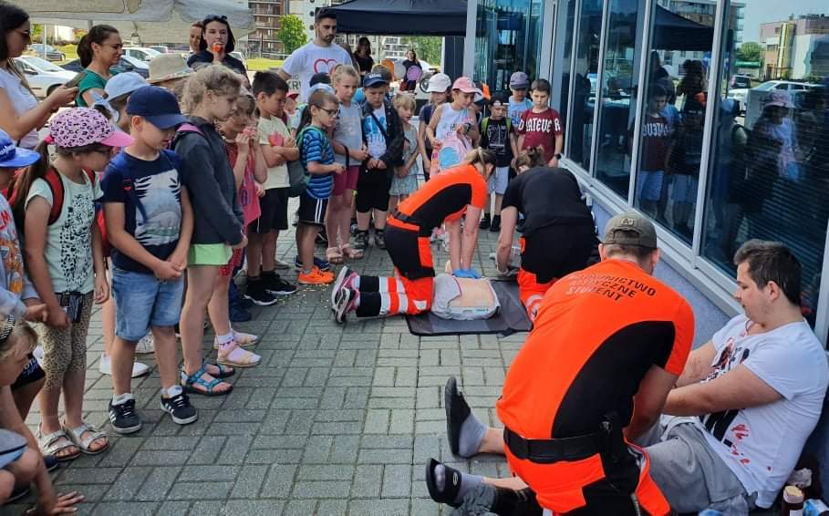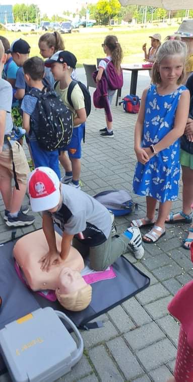 Po seansie uczniowie zostali zaproszeni do wzięcia udziału w pokazach pierwszej pomocy, organizowanych przez Niezależne Zrzeszenie Studentów Uniwersytetu Rzeszowskiego we współpracy z Kołem Ratowników Medycznych Uniwersytetu Rzeszowskiego. Dzieci miały możliwość poćwiczyć resuscytację z użyciem fantomu czy zaopatrzyć rany, które wyglądały bardzo realistycznie, ponieważ na potrzeby pokazu użyto sztucznej krwi. Wychowankowie poradzili sobie fantastycznie z przydzielonymi zadaniami, byli spokojni i opanowani. Spisali się wzorowo, za co też zostali pochwaleni przez ratowników medycznych. Na zakończenie wszyscy pozowali do pamiątkowego zdjęcia.