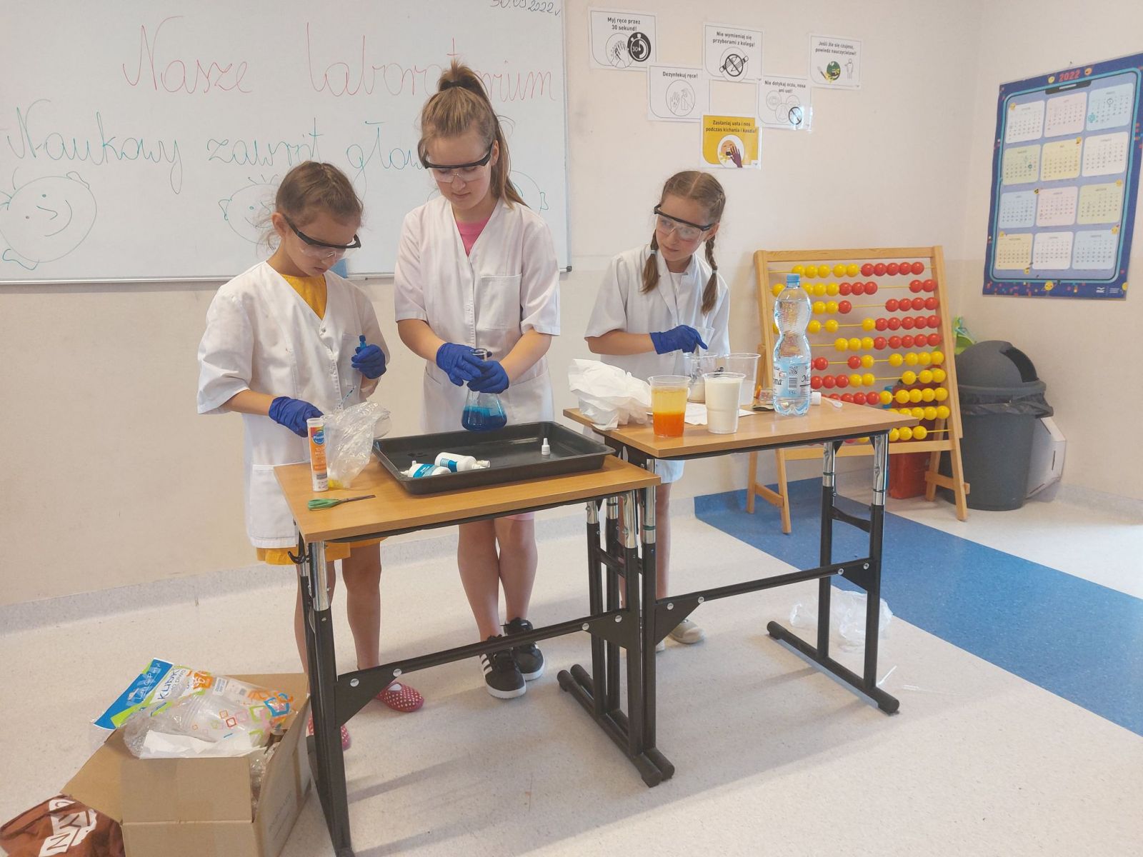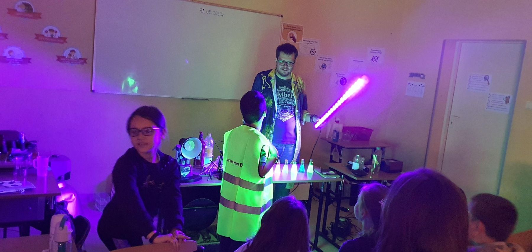 Ten wyjątkowy dzień w klasach trzecich trwała aż dwa dni. Już przed „Dniem Dziecka” w ramach prezentu od Rodziców uczniowie wzięli udział w warsztatach fizyczno-chemicznych pt. „ Być niewidzialnym jak Harry Potter” z cyklu Mądry Dzieciak. Dzięki temu poznali szczegółowo pracę naukowca oraz poszerzyli swoją wiedzę na temat światła, barw kolorów i promieni UV. Następnego dnia uczniowie sami zamienili się w naukowców, prezentując samodzielnie wspaniałe eksperymenty chemiczno- fizyczne.
