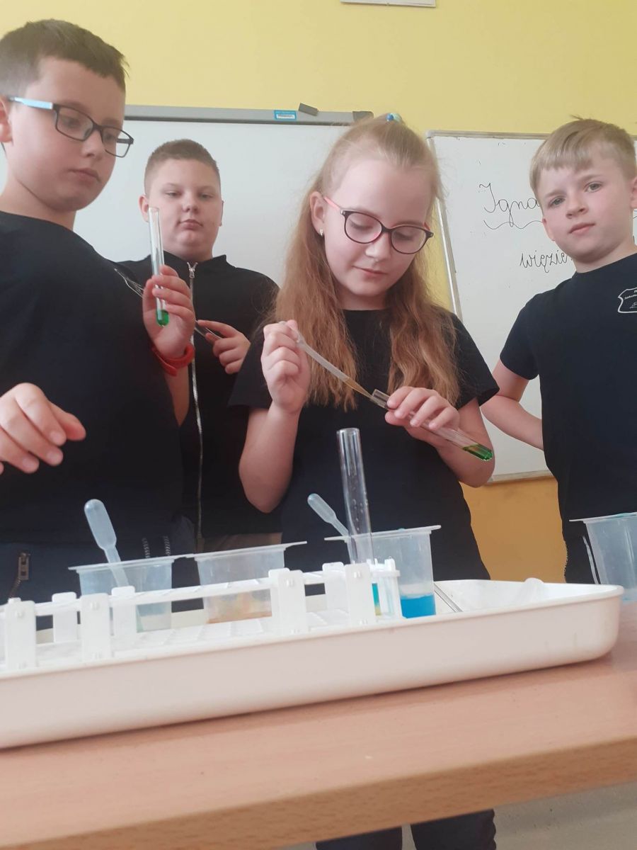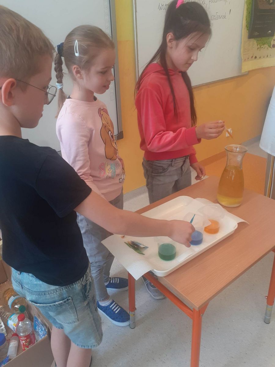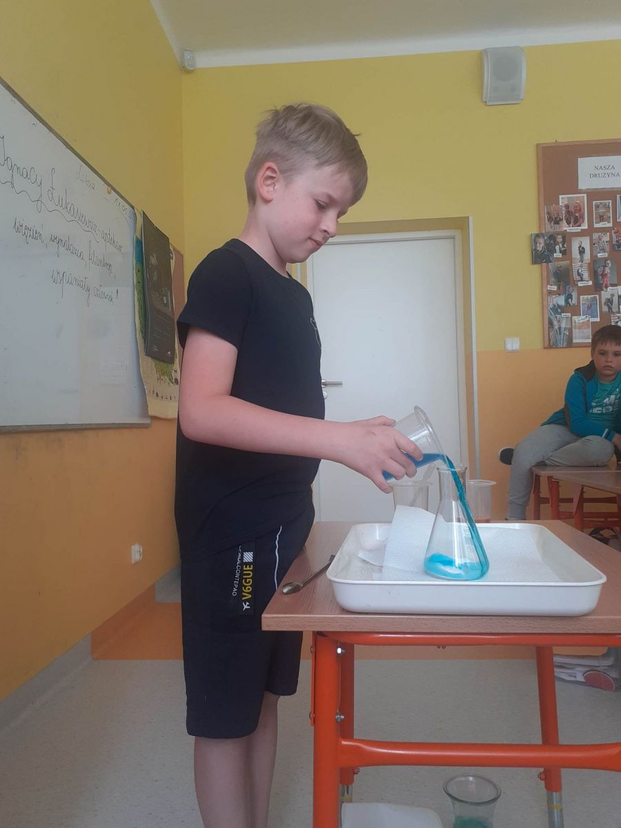 Odwiedziła nas pani Sylwia Ziemiańska, która kiedyś prowadziła eksperymenty w Rzeszowskich Piwnicach. Tworzyliśmy lampę, wybuchający wulkan, tęczę w probówce, a nawet zapłonął ogień. Oczywiście wszystko w bezpiecznych warunkach.