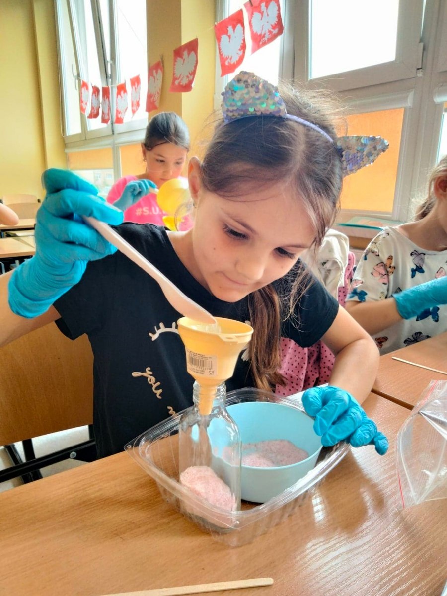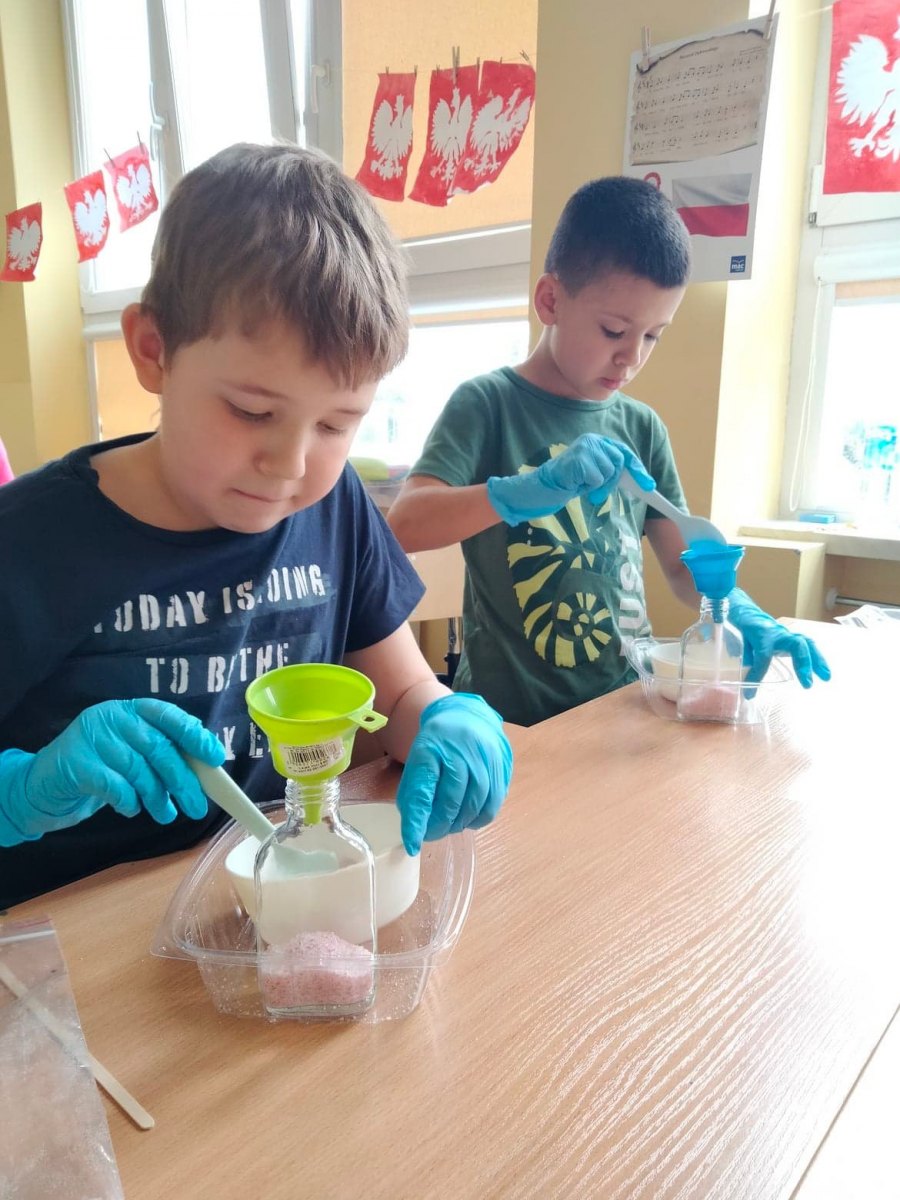 27 maja uczniowie klasy 2a i 2c uczestniczyli w warsztatach chemicznych, które poprowadziła mama naszej uczennicy p. Katarzyna Zając. Podczas zajęć przygotowane zostały naturalne sole do kąpieli. Dzieci miały do wyboru kilka rodzajów soli, do których dodawały według własnego pomysłu odpowiedni barwnik, a także suszone płatki róży czy lawendy. Sole były jeszcze bardziej aromatyczne, poprzez użycie ulubionych zapachów olejków eterycznych. Takie własnoręcznie zrobione upominki wraz z życzeniami uczniowie podarowali swoim mamom w zorganizowanym Dniu Rodziny.