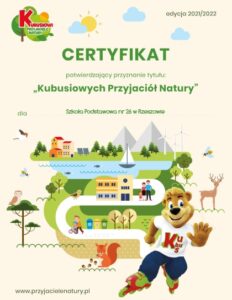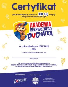 W roku szkolnym 2021/2022 uczniowie klasy 1a, 1b oraz 1c realizowali program edukacyjno – ekologiczny pt. „Kubusiowi Przyjaciele Natury” oraz ogólnopolski program edukacyjny dotyczący bezpieczeństwa pt. „Akademia Bezpiecznego Puchatka”. Pierwszy z projektów miał na celu propagowanie proekologicznej edukacji dzieci i zachęcenie ich do ruchu już od najmłodszych lat. Zaś celem drugiego ww. projektu było przekazanie dzieciom najważniejszych zasad bezpieczeństwa w domu, w szkole, na drodze, w Internecie i w relacjach z rówieśnikami. Dzięki pomocom dydaktycznym nauczyciele wraz z uczniami realizowali ciekawe i pasjonujące zajęcia. Uczniowie mogli bawić się, uczyć i poznawać świat przyrody oraz zgłębiać zasady bezpieczeństwa.